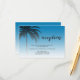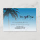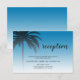 Mottagningskort för bröllop på chicen med en ritning av det tropiska handflatan träd på en ljusblå bakgrund med elegant och modern typografi. Ibizas blåa tonas ut mot en vit bakgrund. Lägg bara till dina uppgifter om bröllop till det här snyggten, jakande boendekortet för tropisk strandbröllop. Enbart designad för dig av Lycklig Dolphin studio.