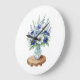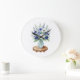 Blå och vita vilda blommor i blått och vitt vas sitta på en avföringsvägg.