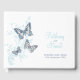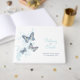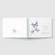 Vackra konstfjärilar och blommigt grafik snurra bröllop gäst bok i himlar blå, korallisk och mörk blått på vitt. Anpassa med din egen namn och bröllop-dejt. Andra matchande artiklar är tillgängliga. Sarah Trett skisserade konst och grafisk design i bläck på originalet av butterfly för www.mylittleedenweddings.com