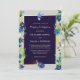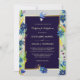 Den här söt bröllopsinbjudan innehåller gräns av blå och violetta vildblommor. Bland blommorna finns grönt löv, guld och orange vild vetesprit och blått och korallfröhuvud. Överst är en liten blå fågel med en blommar i blåringan. Vid grund finns en liten bukett av vilda blommor. Er text är i ljus guld i centrum och placerad på ett mörk blått avsnitt som är inramat i guld. Blomman gräns, fågelbilden och buketten täcker över ram i guld. Allt placeras på en elegant silver grått-bakgrund. Baksidan av inbjudan är solid passande mörk blått och den lilla buketten upprepas vid grund. Elegant, modern och lämplig för bröllop under alla årstider!