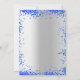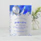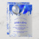En 18:e (eller någon annan ålder) födelsedagsfest inbjudan. På framsidan: En faux silver-bakgrund. Dekoreras med royal blå faux glitter-droppar, färgdroppstift och ballonger. Anpassa och lägg till information om namn och party. Namn är skrivet med ett handskript i stil.
