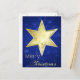 En gyllene stjärna med snöflingor på en blå bakgrunds och God jul kalligrafitext.