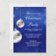 En modern inbjudan till julfesten som innehåller silver snöflammande prydnadsföremål på en mörk blått båge. Perfekt för en företagsklara julfest, julfest av företag, julfest av företag, insamling och mycket mer! Anpassa enkelt med din händelseinformation. Utformningar är platta tryckta bilder/grafik - INTE FAKTISK SILVERFOLIE.