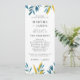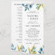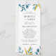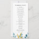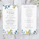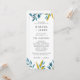 Det här blå botaniska bröllopsprogrammet har mjuka vattenfärgsfärger, modernt typsnitt och en ren enkolumnslayout. På framsidan finns ceremonin och på baksidan visas alla medlemmar i bröllopsfesten. Helt redigerbart för att matcha namnen, rollerna och meddelandet. Para vackert med andra artiklar i samlingen Blue Botanical Bröllop.