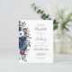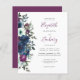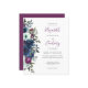 Den här romantiska bröllopsinbjudans lämnat hand-kant har en blommigt av av plommon lila och marin blåa blommor och grön. Anpassadet kombinerar handskrift, tryckplåt och kursivt typsnitt i grått i kol mot vit bakgrund. Den omvända sidan är ett samordnande fast plommon.
