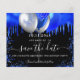 En svart bakgrund som dekoreras med royalets blå droppar, konfekt och ballonger. Anpassa och lägg till datum och namn/ålder. Texten Spara datum skrivs med ett stort trendig-handskript i stil.