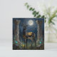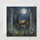 A black and gold Gazelle themed blank notecard. On the front is an illustration of a majestic gazelle with fur like molten black and gold, standing in ancient ruins bathed in ethereal moonlight. Intricate carvings adorn crumbling stone pillars, and bioluminescent flora casts a soft, otherworldly glow. The scene is rendered in a rich, textural oil painting style with thick impasto strokes.