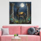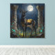 A black and gold Gazelle themed wall art. On the front is an illustration of a majestic gazelle with fur like molten black and gold, standing in ancient ruins bathed in ethereal moonlight. Intricate carvings adorn crumbling stone pillars, and bioluminescent flora casts a soft, otherworldly glow. The scene is rendered in a rich, textural oil painting style with thick impasto strokes.