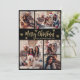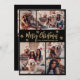 Modern Elegant Script Black and Guld Snowflake 5 Photo Collage God jul Script Helgdag Card. Den här sjutna, minimalistiska, vimistaktiga, fem (5) fotokortmallen innehåller ett fotokollage i söt, en del snöflake och säger "God jul"! Texten "God jul" hälsning är skriven i ett vackert handskrivet calligrafteckensnitt i guld på svart bakgrund från färg. På motsatt sida med din meddelandemall för hälsning med 3 små snöflingor en fotomall. Kort för hälsning till din familj och dina vänner i julens Julhelg.