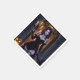 En söt häxa som håller en papper servetter i Halloween fest i svart, lila och orange.