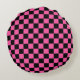 A vibrant checkerboard pattern of black and bright pink squares, creating a visually striking and bold contrast. The design is uniform and symmetrical.