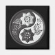 A yin yang symbol features intricate floral patterns on each side, one half in silver and the other in black. Delicate leaves and swirls add to the symmetrical elegance.