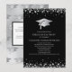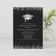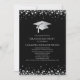 This modern design features a graduation hat and confetti in silver on a background of black with white text.