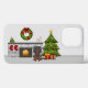 Desteis ursprungliga illustration av en söt svart tecknad och färg Cavalier Kung Charles Spanska rasade hund. Hund är placerad i ett festligt vardagsrum som har en kamrat. Två röda strumpor hänger på kamermanteln. På toppen av kaminen finns en grönt som dekoreras med en röd båge och vissa gulter som ljus. Ovanpå manteln finns det tre små triangelformade träd som också är dekorerade med gult cirklar. På andra sidan manteln finns två beige ljus. Bredvid bytet finns en festlig grönt Julgran med två presenter under. Julgran är dekorerat med rött och gult och grått. På träd överst finns en gult stjärna.