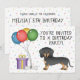 Utformning av matlagningsdagtid med Desteis ursprungliga tecknad illustration av svart och jacka hund av färg kort-hår av Dachshund-ras. Bredvid hund finns det färgstarka födelsedagsballonger som är bundna på ett hund ben och en lila och gult färg. Bakgrunden har en lekfull mönster av färglösa pastellkonfetti på vit bakgrund. Anpassa exempeltextområdena med information om händelsen.