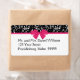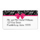 Den här formella returadressetiketten för bröllop innehåller en svart elegant och vit ros mönster och en shock rosa båge.