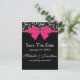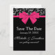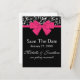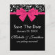 Meddela ditt bröllop-datum med det här spara det datumvykort som innehåller en elegant svart och vit ros mönster, en shock rosa och vit text på en svart bakgrund.