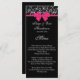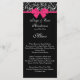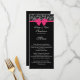 Den här formella bröllopsmenyn innehåller en svart elegant och vit ros mönster, en shock rosa och vit text på en svart bakgrund.