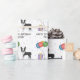 Utformning av matlagningsdagtid med Desteis ursprungliga tecknad illustration av en söt svart och vit jacka färg Boston Terrier-hund. Bredvid hund finns det färgstarka födelsedagsballonger som är bundna på ett hund ben och en lila och gult färg. Bakgrunden har en lekfull mönster av färglösa pastellkonfetti på vit bakgrund. Det finns också ett anpassningsbara textområde.