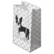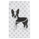 Desteis ursprungliga tecknad illustration av en söt svart och vit jacka färg Boston Terrier-hund. Bakgrunden har mönster i grått hund tass avtryck.