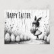 A stylish black and white illustration featuring a cute girl with bunny ears holding a basket of Easter eggs. The minimalist and slightly whimsical scene blends artistic charm with a modern Easter aesthetic.