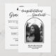This elegant graduation announcement features a clean, modern layout with a timeless black-and-white aesthetic. At the top, a graceful script font reads “Congratulations Graduate,” adding a celebratory yet sophisticated touch. The centerpiece is an arched photo frame showcasing the graduate’s portrait, creating a soft, classic look that draws attention to the image. Below the photo, the graduate’s name, school, and class year are displayed in a simple, easy-to-read font for a polished finish. Perfect for high school or college graduates, this design blends minimalism with refined style, making it ideal for sharing this important milestone with family and friends.