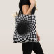 A tunnel-like optical illusion is created using a black and white checkered pattern, giving a dizzying sense of depth