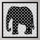 Den här digitala grafikondesignen har en svart och vit polka punkt silhouette mönster i form av en elefant. elefanten ställs in mot en grått- och vit svartvit polka-punktbakgrund med vita punkter.