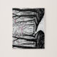Utformningen är ett svart och vitt teckning i ett väg i en skog. Det finns en liten vandringsväg genom denna skog där observatörer kommer att märka att lila abstrakt löv hovrar över skogen.