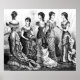 vintage svart teckning i svartvitt från segrare dam som socialiserar och bär klasser och rika tittar segeroriska klänningar med kullor och knärör och bär halsband och håller fläkt i ett rum med fem kvinnor i den gamla världen eller i boll, skapar ett vackert svart och vitt struktur med elegans