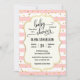Trendig ännu söta inbjudningskort för babydusch i svart kalligrafi-skript i svart brev. Vit och lätt pastelliserad rosa strimlade mönster på ett ge i glitter som ser modernt ut. Faux guld konetti för duscheffekten. Perfekt för flicka babyduschen. Hämta matchande klistermärken!