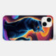 A sleek black cat with glowing golden eyes sits majestically against a swirling galaxy background