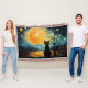 Krymliga roliga djur, nattstad och stjärntur himmel. Den söta lilla svarta katten tittar till himmel, inspirerad av Vincent van Gogh. Färgfullt fantasinum. Digital oljemålning, bra konst.