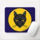 A retro-looking illustration of the face of a yellow-eyed black cat appears in a moon-like circle in this original Halloween-appropriate art by Richard H. Fay.