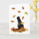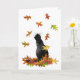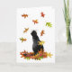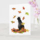 En svart katt tittar på färgad löv som faller på detta höstkort, lägg till ditt eget ord för att anpassa.