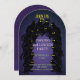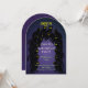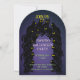En lila Halloween inbjudan med en arkväg av svarta silhuetter av katt med glansande spooky ögon. Perfekt för skämt social, unge party etc.