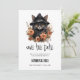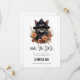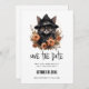 Spara datumkortet med en söt illustration. En svart, långdragen katt som bär en svart häxhatt. Öron pockar ut. Omgiven av orange och bruna höstblommor. Fantastisk-design för häxteman gåvor och evenemang och Halloween.