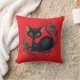 Filigree Black Cat with large green eyes sitting in a cradle of flourishes and black flowers on a bold red background cushion / throw cushion.