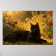 A black cat resting regally in a garden of colorful flowers, captured in warm, golden hour light. Rendered with the depth and texture of a classical oil painting.