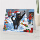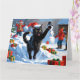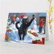 En helgdag med hjärtan som visar en glad katt som leker i snö, bär en julhatt och omgiven av färgfulla presentlådor. I bakgrunden bygger barn snögubbe bredvid ett Julgran som är täckt av snö och skapar en glatt vinter under. Perfekt för att sprida helgdag och fånga julens magi.