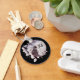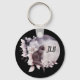 En nyckelring med en vattenfärgsmålning av en svart katt och en lätt lila och rosa blommigt bukett. Stå framför ett stort fullt måne. Snyggt och magi.