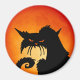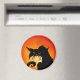 Skarig svart katt med orange öga framför en stor, fullt, orange måne.