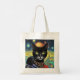 En skapat utskrift av en svart katt med ett detaljerat färgat och ljust gult ögon avtecknas mot en stjärnmörk himmel fylld med snurrande färg.