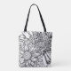 This tote bag features an oversized line art drawing of chrysanthemums in black with a personalized name. Original art from Dogwood & Thistle.