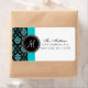 Utformning av ljus med svart fuktmönster för vintage med tryckt teal eller akvblått glitter och inledande monogram. Användan den här roligten Adressetiketter med ditt första monogram, med information om namn och adress för dina bröllopsinbjudningar, bröllop-tack för kort eller inbjudningskort för möhippa med mera. För annan ägare av kontaktbutiken för glitter färg. Copyright Elke Clarke.