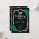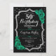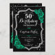 Elegant 50-årsinbjudan med ditt foto på baksidan av kortet. Glam Black and emerald grönt design med faux glitter silver. Har grönt ro, skriptteckensnitt och kontur. Perfekt för en snyggt vuxen under firande party. Anpassa med dina egna detaljer. Kan anpassas för vilken ålder som helst! Skrivna Zazzle-inbjudningar eller digital utskrivbar mall för omedelbar nedladdning.