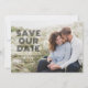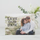 Geometric retro art deco black text over an förlovning foto bröllop spara datum. Baksidan har minimalistisk information med en webbplats QR-kod på baksidan (även om den kan raderas) med en klassisk vit bakgrund och svart text. Teckensnittet stil har en rand-motiv med fetstilta geometriska former och linjer. Teckensnittet och färgen i bakgrunden är fullt anpassade.