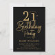 Gold and black 21st birthday party invitation. Trendy modern design, perfect for a stylish men's or women's bday celebration. Features script font and stylish stripes o the back. Customize with your own details. Printed Zazzle invitations or instant download digital printable template.