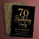 Black gold 70th birthday party invitation. Trendy modern design, perfect for a stylish men's or women's bday celebration. Features script font and confetti. Customize with your own details. Printed Zazzle invitations or instant download digital printable template.