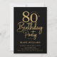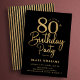 Black gold 80th birthday party invitation. Trendy modern design, perfect for a stylish men's or women's bday celebration. Features script font and stripes on the back. Customize with your own details. Printed Zazzle invitations or instant download digital printable template.